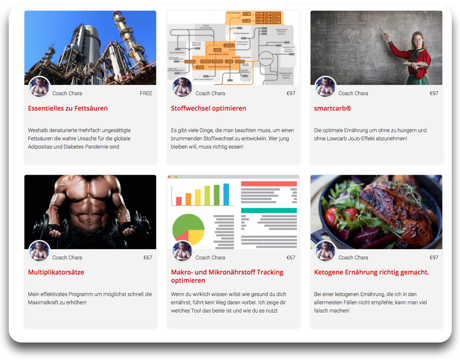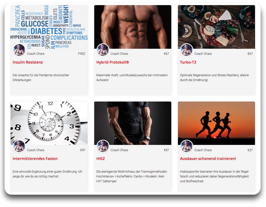 Die Dokumentation deines Coachings erfolgt ebenfalls in diesem Bereich. Ich stelle darin auch Workouts und andere Video-Tutorials für dich bereit, unter anderem zur Benutzung der professionellen App zur Nährstoffanalyse. Da der Bereich wie ein Kurs aufgebaut ist, kannst du ihn auf allen Plattformen über den Kursplayer der Onlinekurs Plattform nutzen.